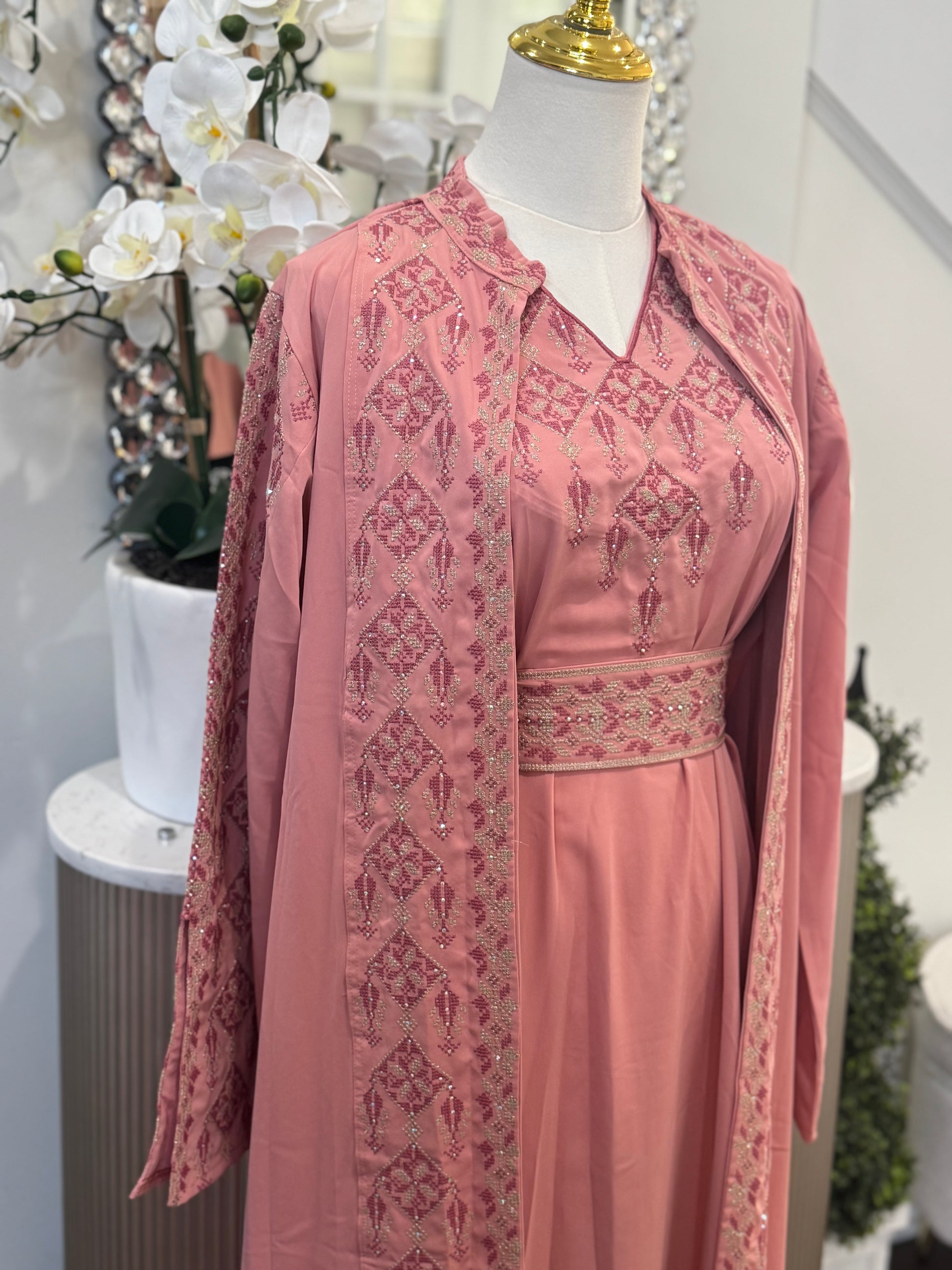 - Fully Tatreez matching with fabric color Embroidered Abaya – Intricate embroidery on both front and back.
