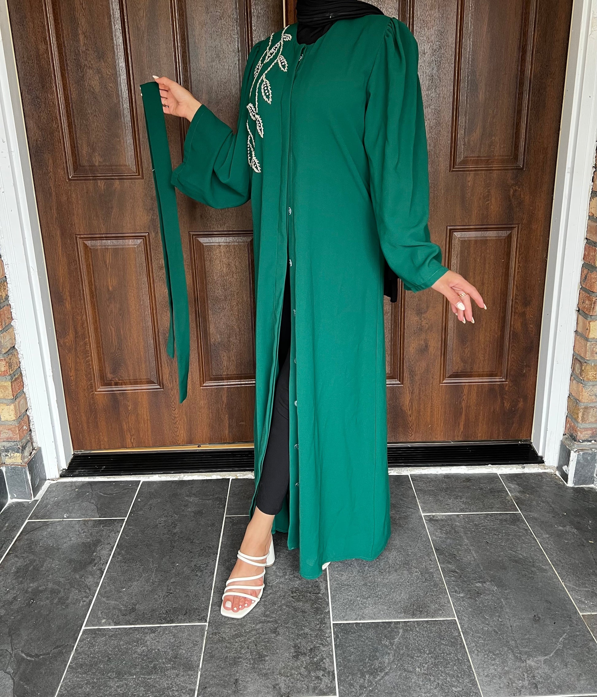 Description: . Hand beaded abaya. Button up closer all the way down . Can be worn in many way as open abaya nor closed.