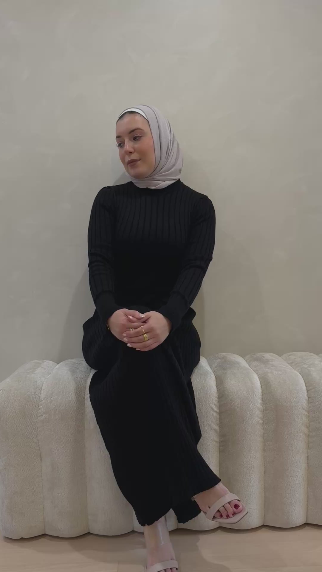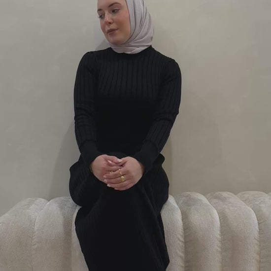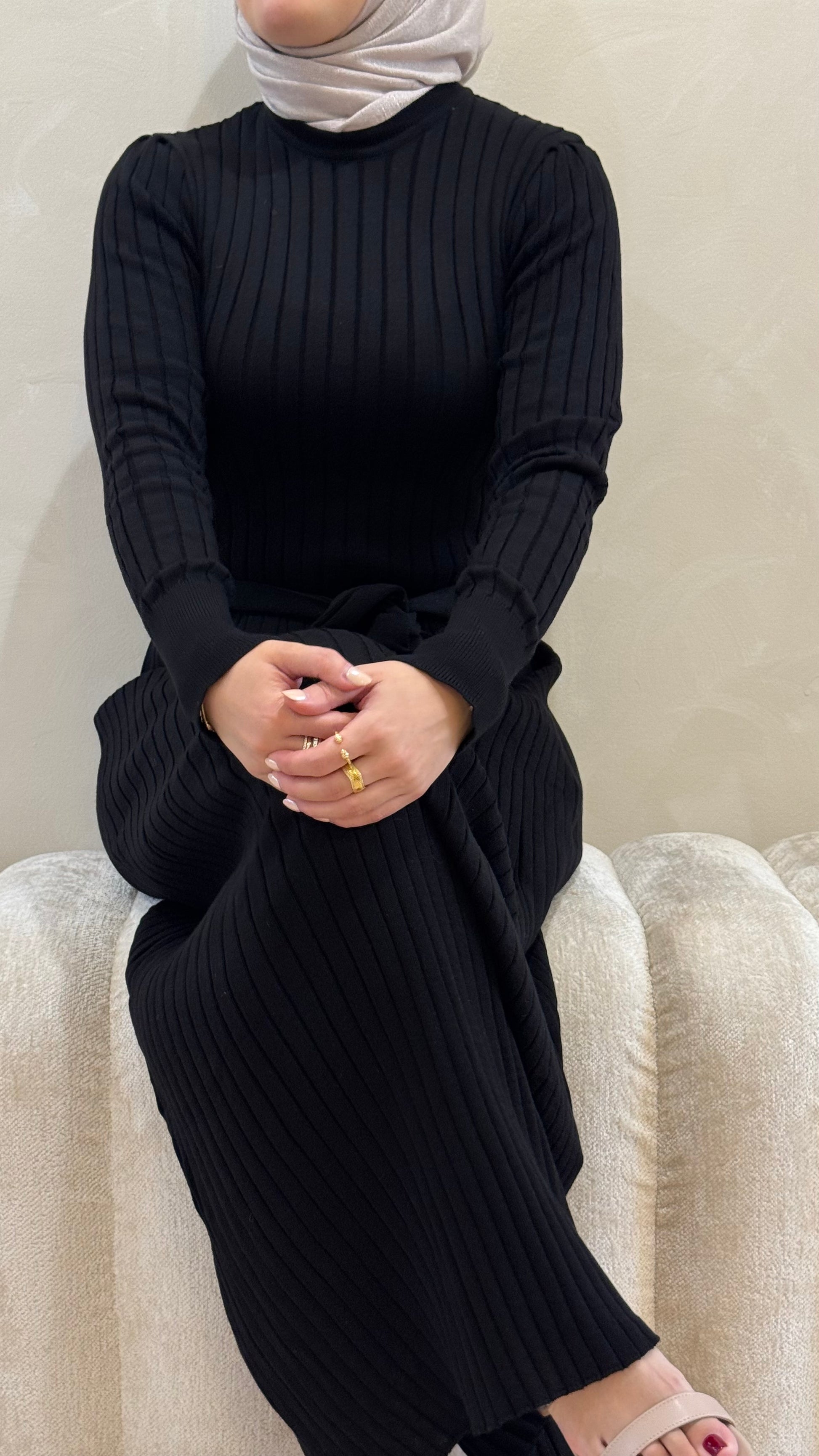 Color and Fabric: The dress is black and made of a ribbed knit material, which gives it vertical texture.