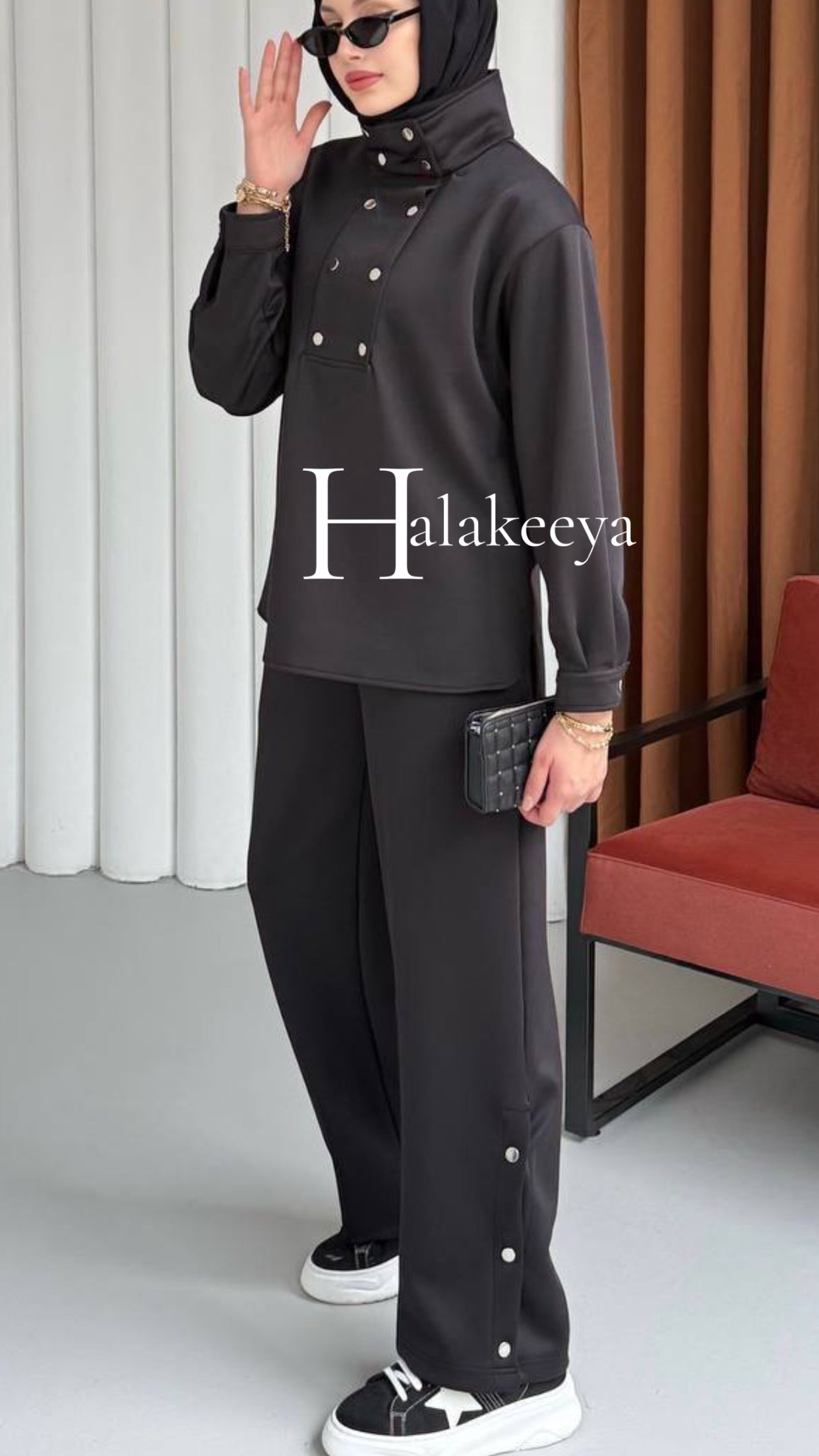 Coordinated Set (Tracksuit/Lounge Set): The main outfit is a matching two-piece set in a solid, deep black or cocoa brown colors. The material gives it a comfortable, lounge-ready look.