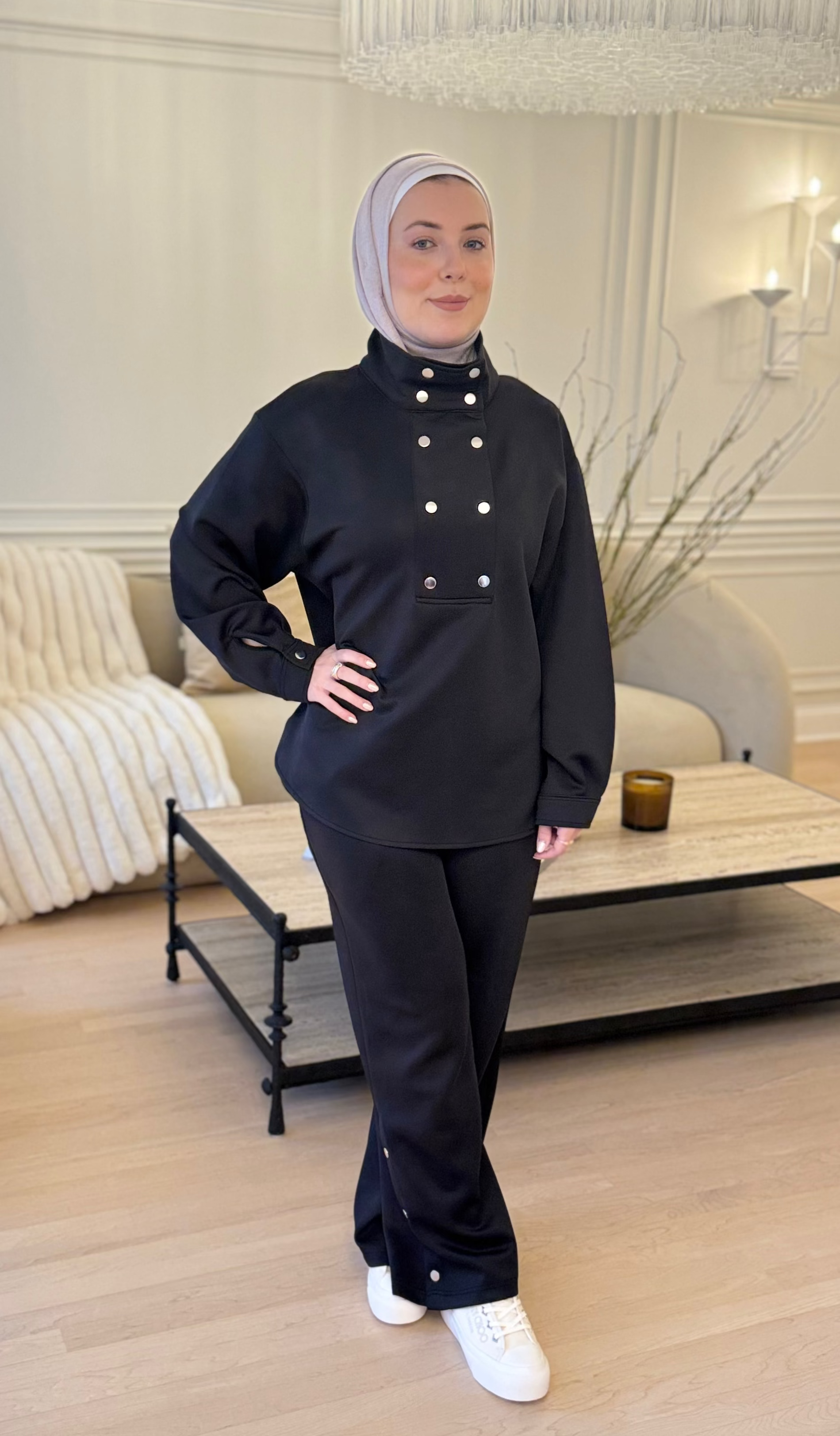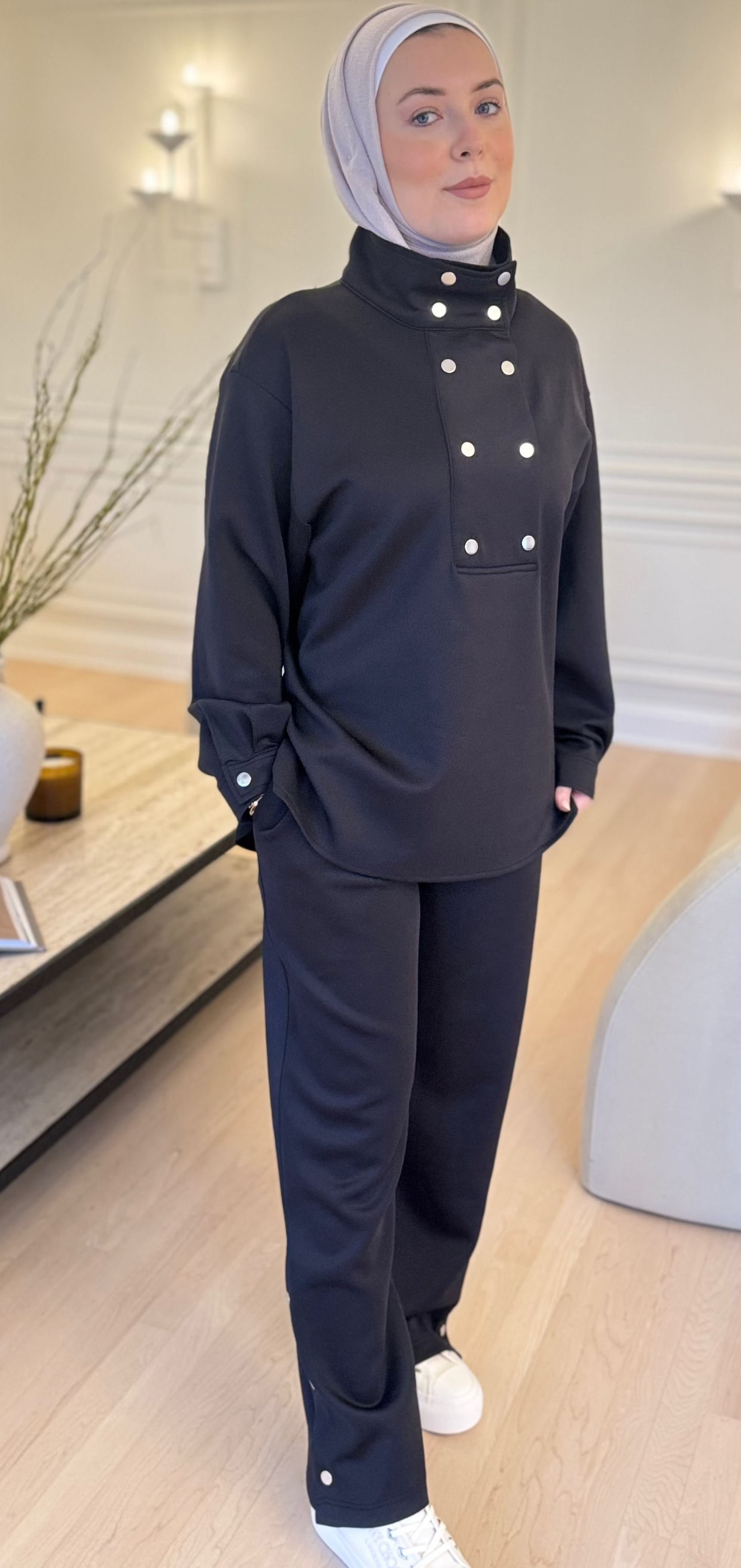 Top: This is a long-sleeve, oversized tunic or long-line sweatshirt. It features a prominent high, funnel-style collar and a striking detail of two vertical rows of silver snap buttons