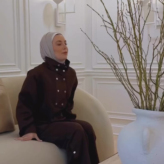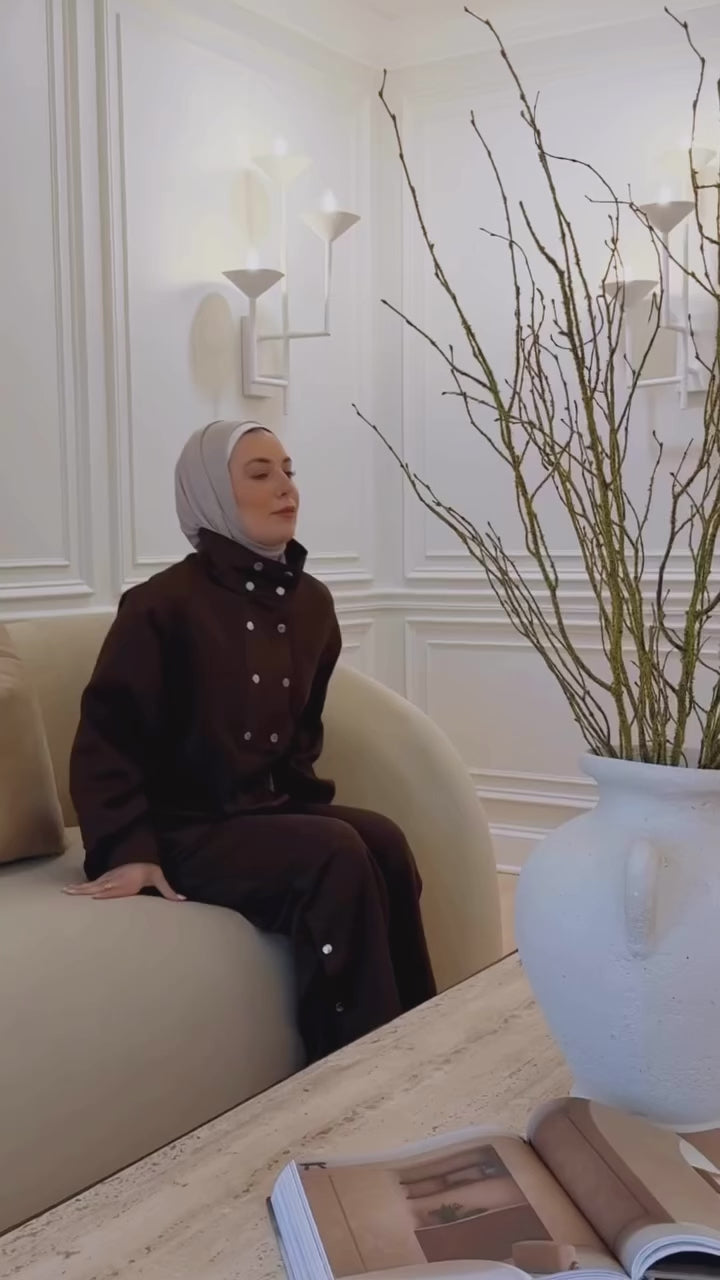 Bottoms: The matching pants are a straight-leg or wide-leg style, continuing the relaxed and modest silhouette of the top.
