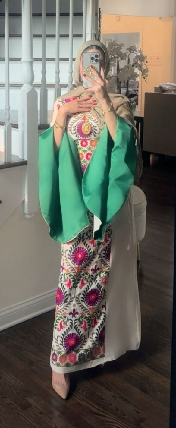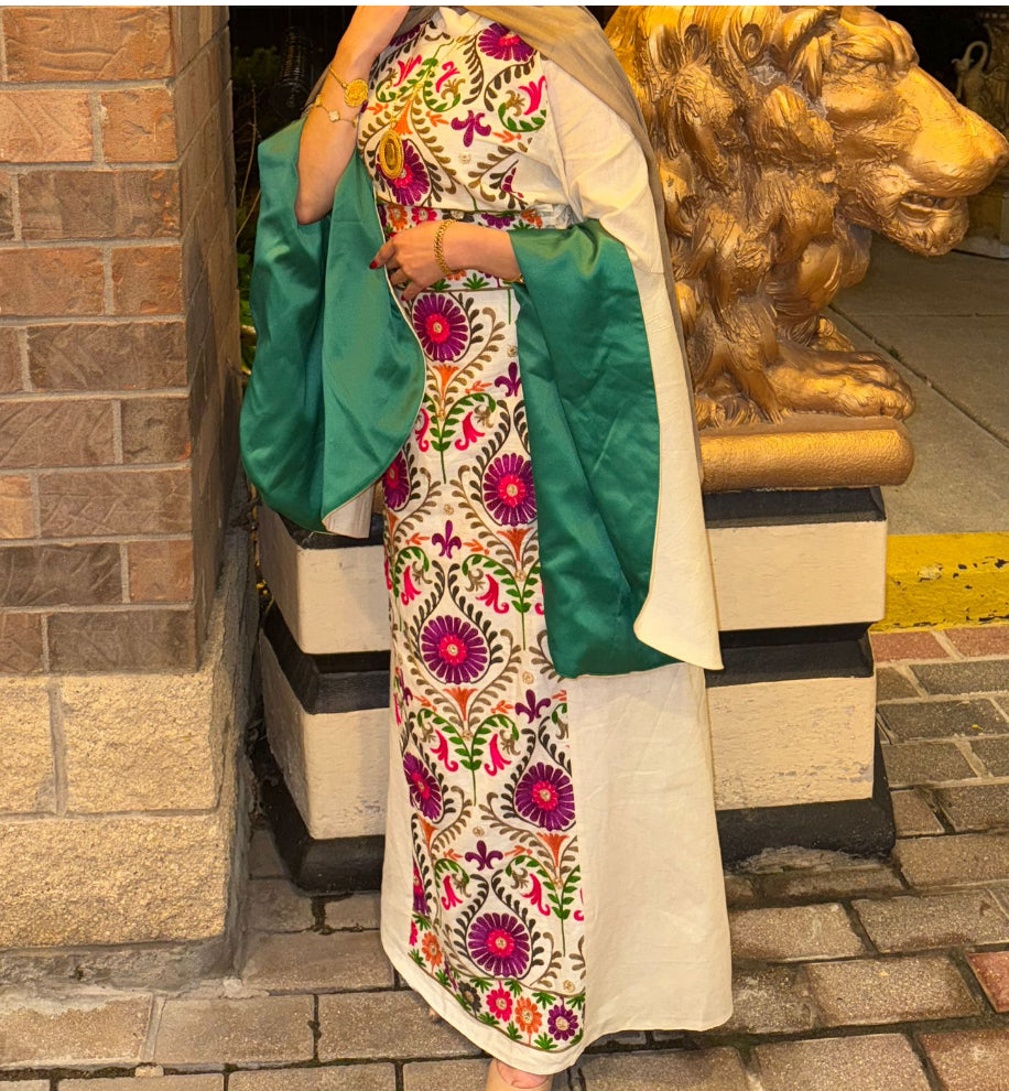 This outfit features a traditional long embroidered dress crafted on an off-white base fabric. The front panel is richly decorated with colorful floral and vine motifs in bright fuchsia, green, orange, and purple threads, showcasing artistry and heritage. It is paired with a beige outer layer lined with deep green satin, adding contrast and sophistication. Gold accessories complete the look, enhancing its regal and graceful style.