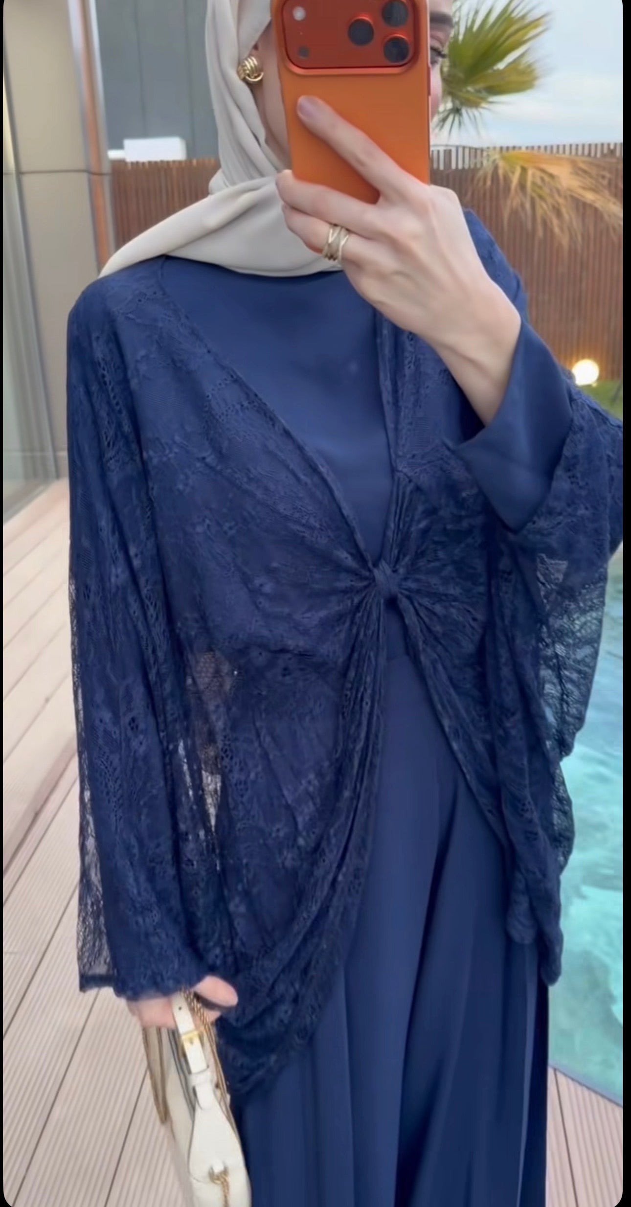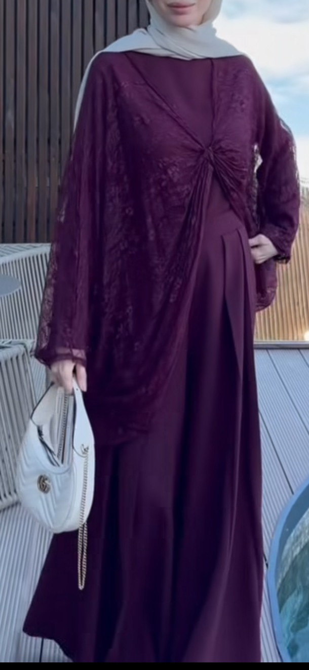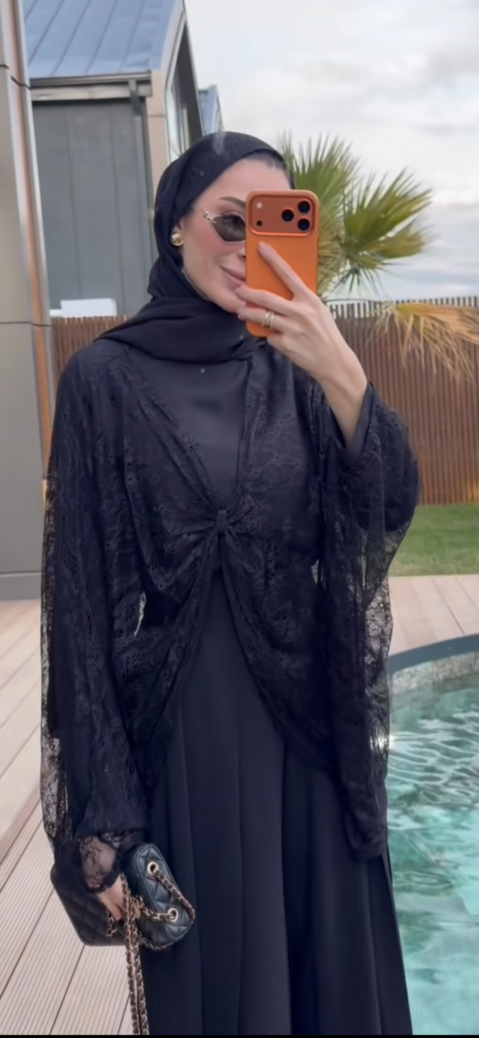 A refined and modern modest set featuring a delicate lace overlay top layered over a long-sleeve inner shirt, paired with wide-leg flowing pants. The lace top adds texture and sophistication with its soft drape and front detail, creating an effortlessly graceful silhouette.
