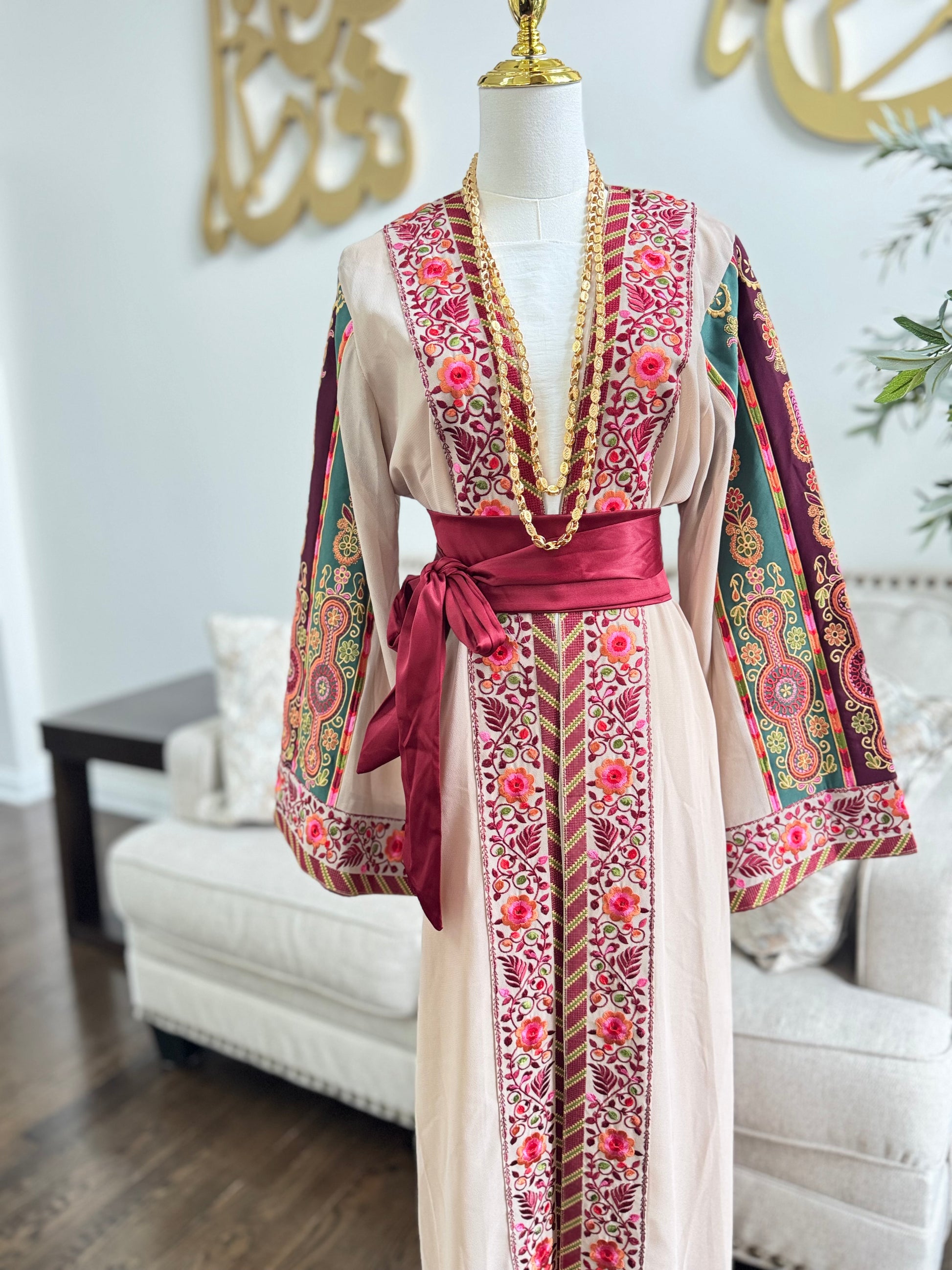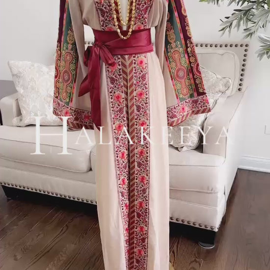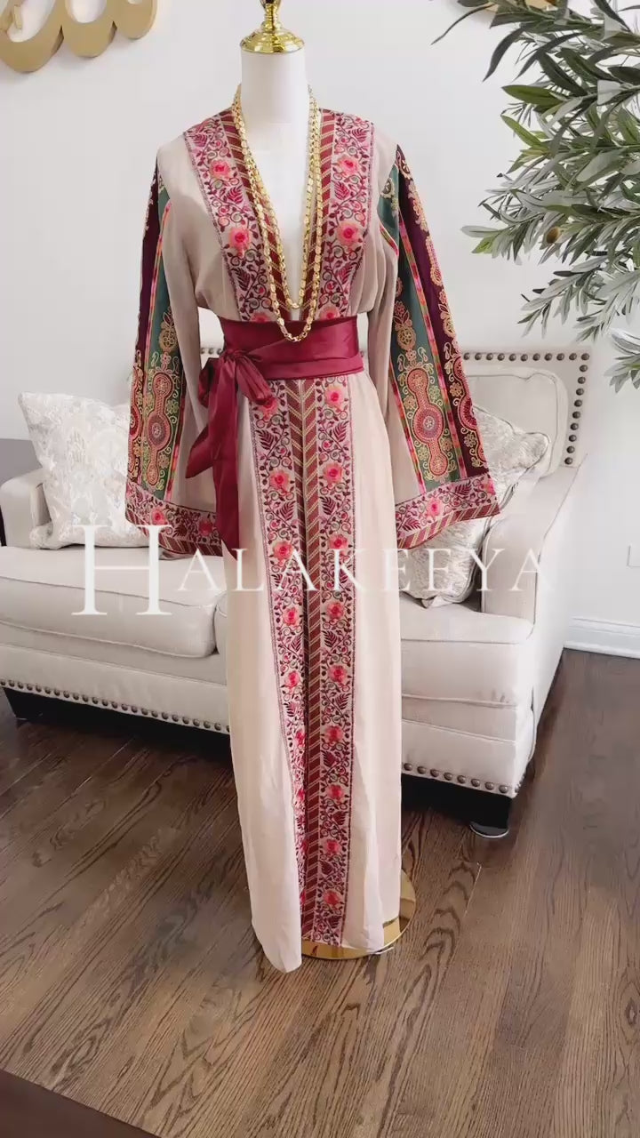 This elegant open abaya thobe is a stunning blend of tradition and refinement. Crafted from a soft, flowing chiffon beige fabric, it features exquisite Palestinian-inspired floral embroidery running along the front panels and sleeve cuffs in rich shades of burgundy, rose pink, green, and gold.