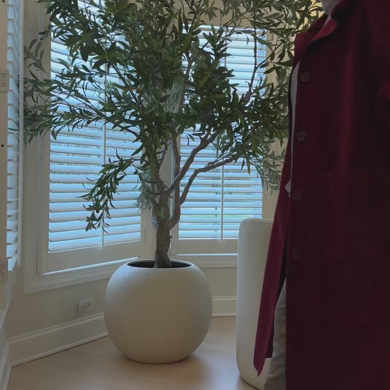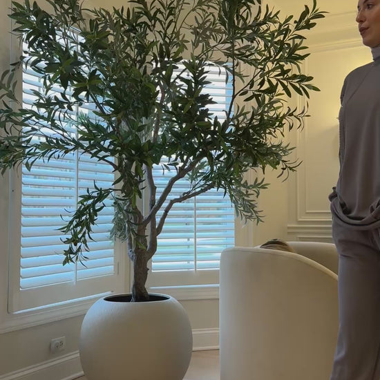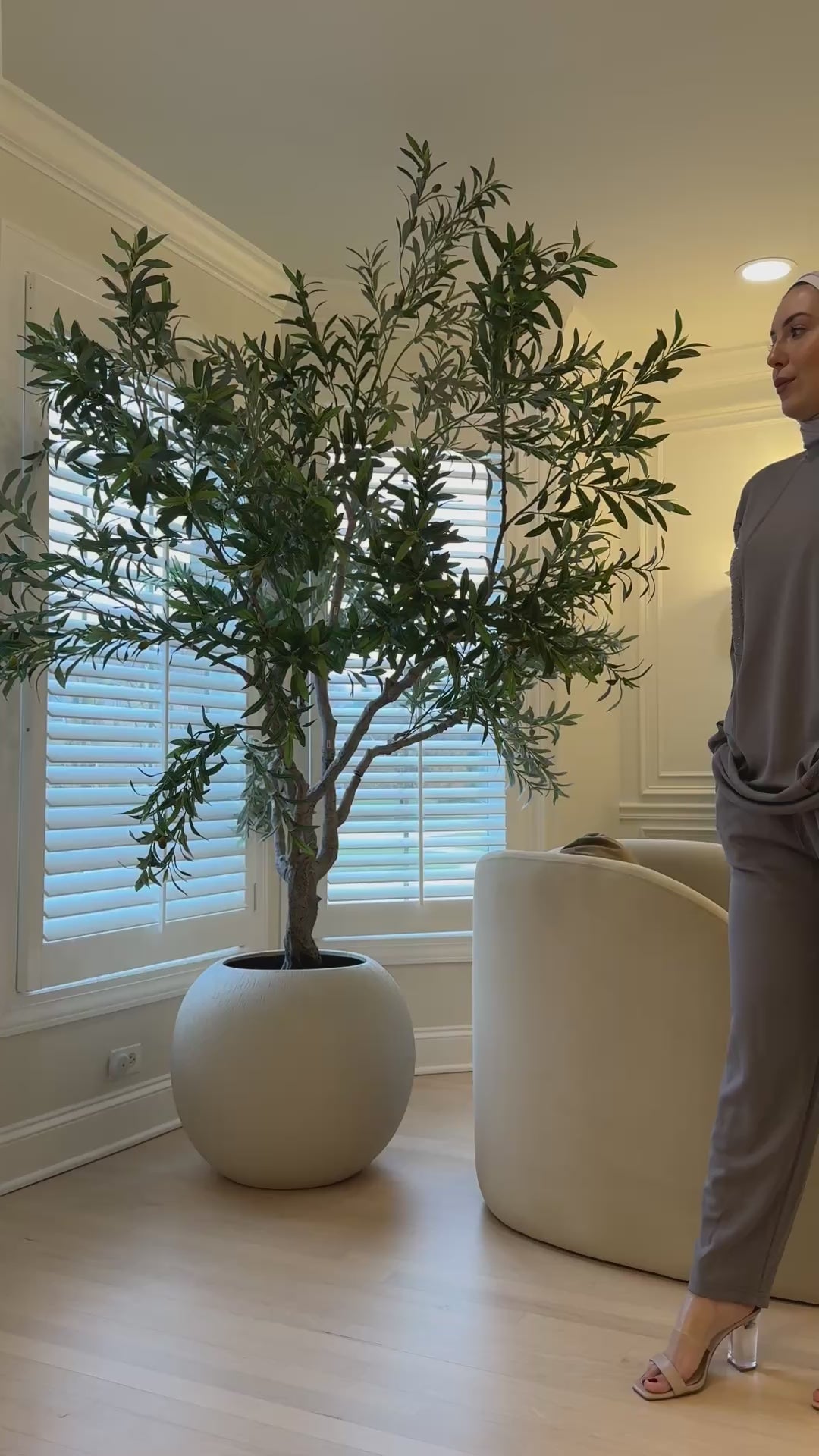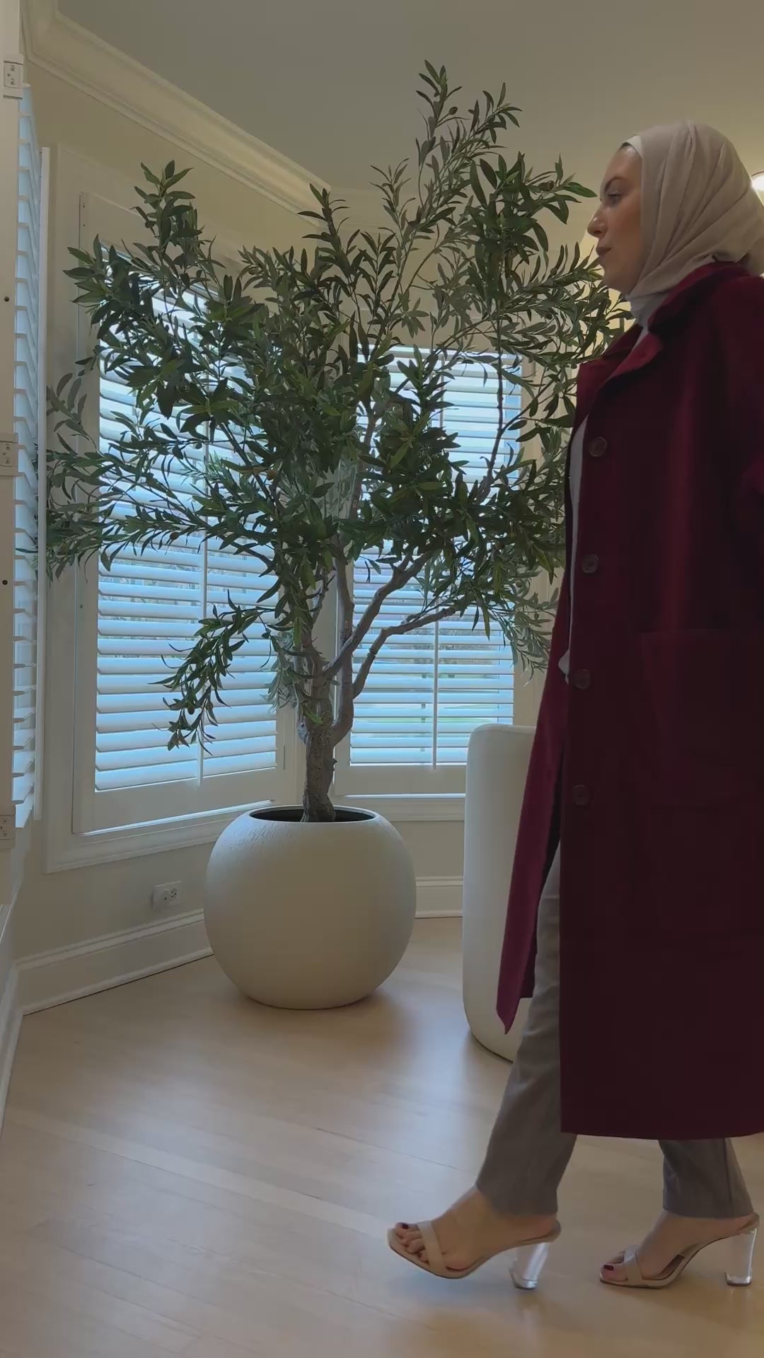 Bottoms: The trousers are relaxed, full-length, and match the color and material of the top.