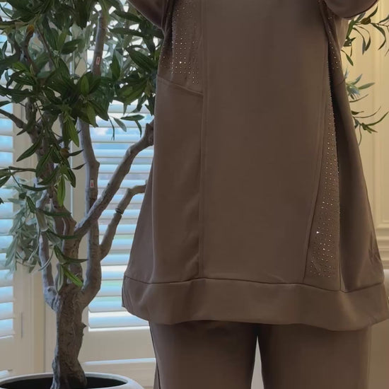 Top: The top is long, loose-fitting, and tunic-style. It features subtle embellishments small studs on the shoulders and across a diagonal panel on the chest, adding texture and sparkle. It has a high neckline.