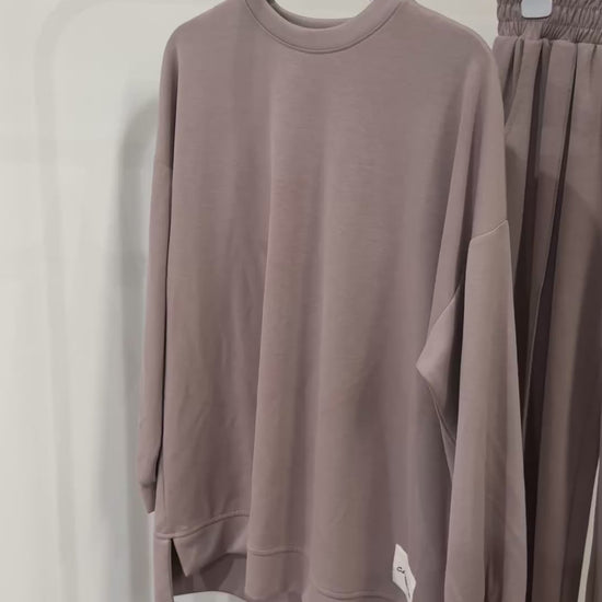 a matching, loose-fitting two-piece outfit , a modest, casual-chic ensemble. The top is a long-sleeved, oversized sweatshirt, and the bottom is a pair of wide-leg trousers. A small, light-colored patch or tag is visible on the side of the sweatshirt near the hem.