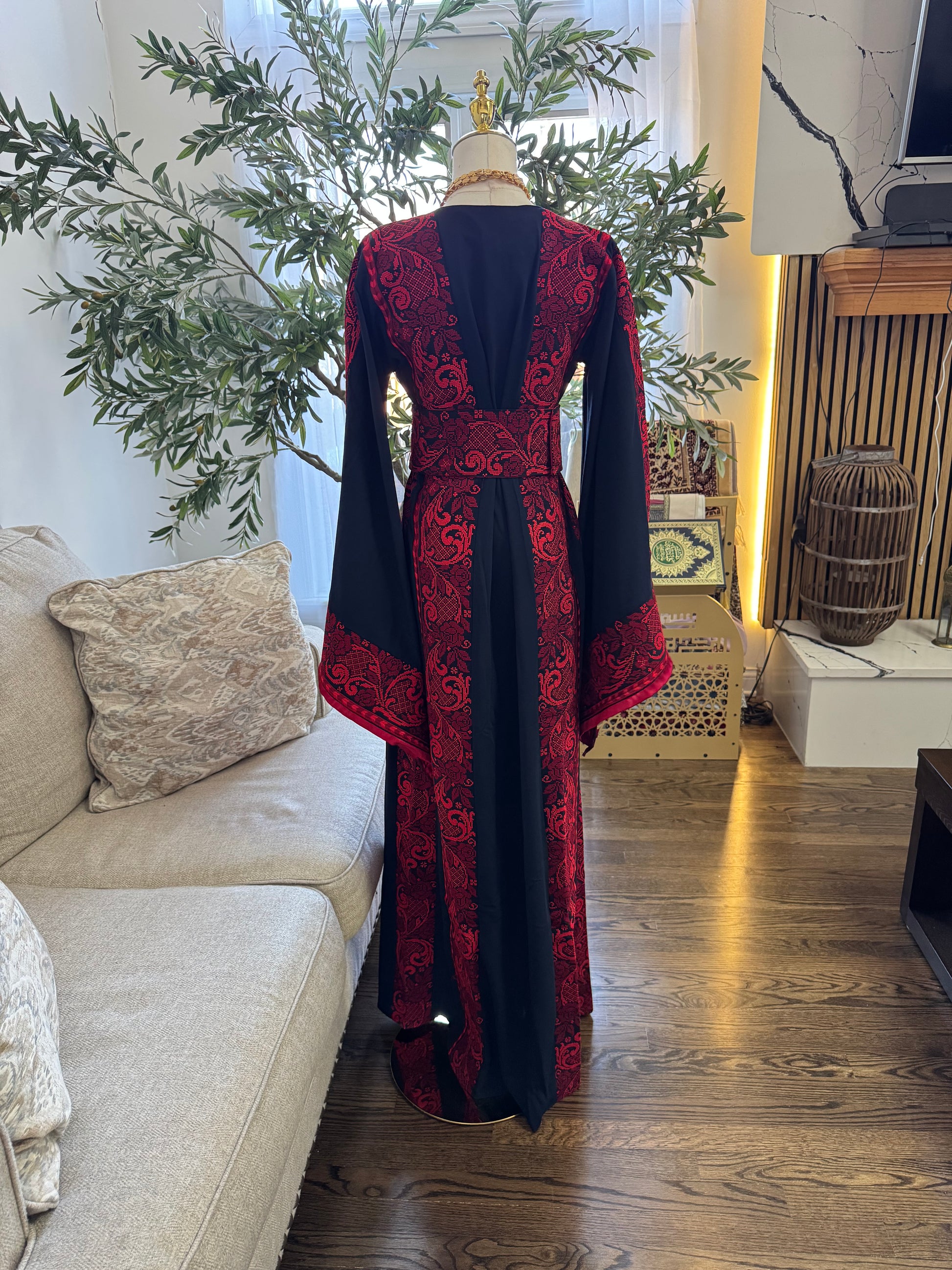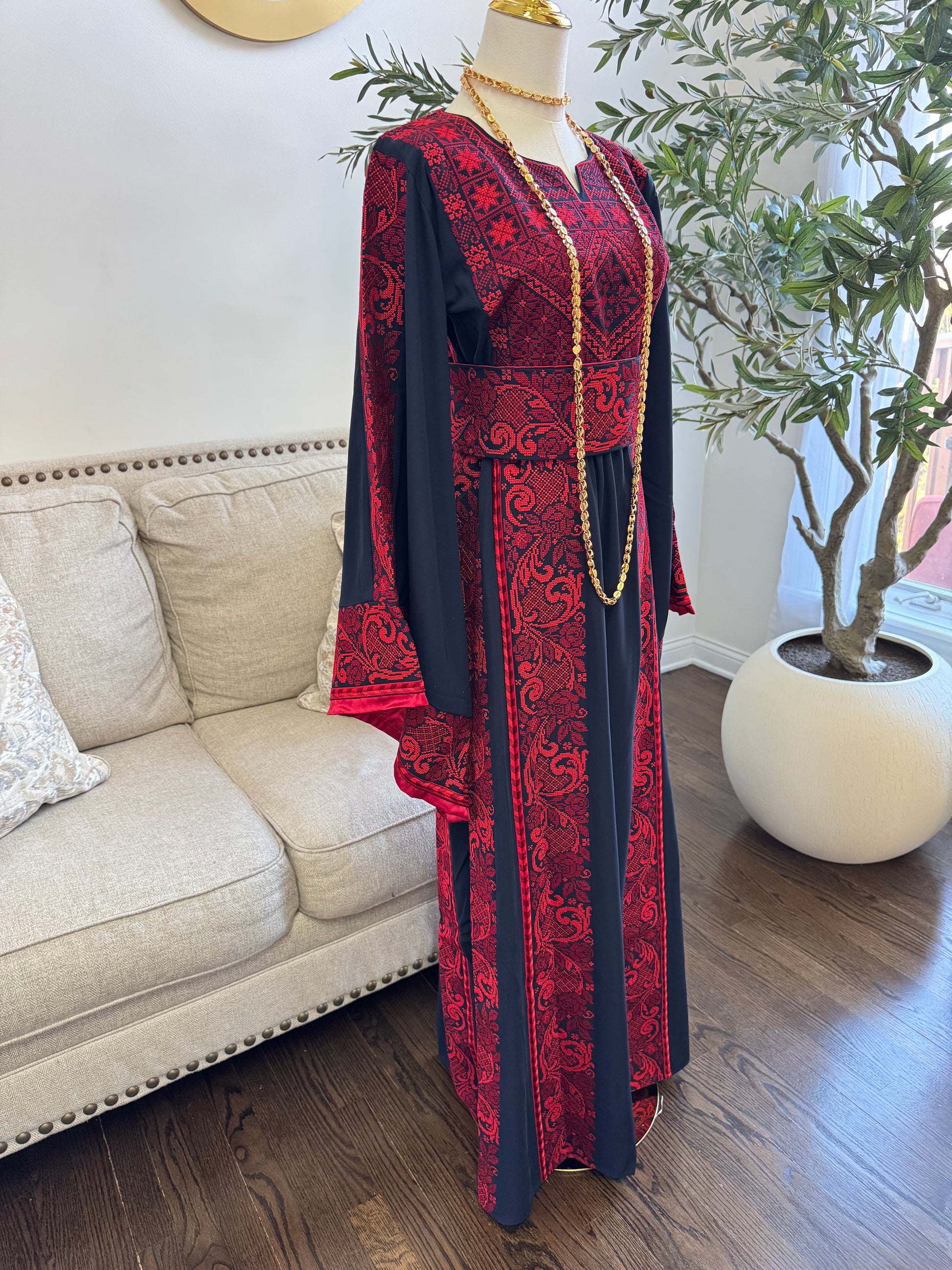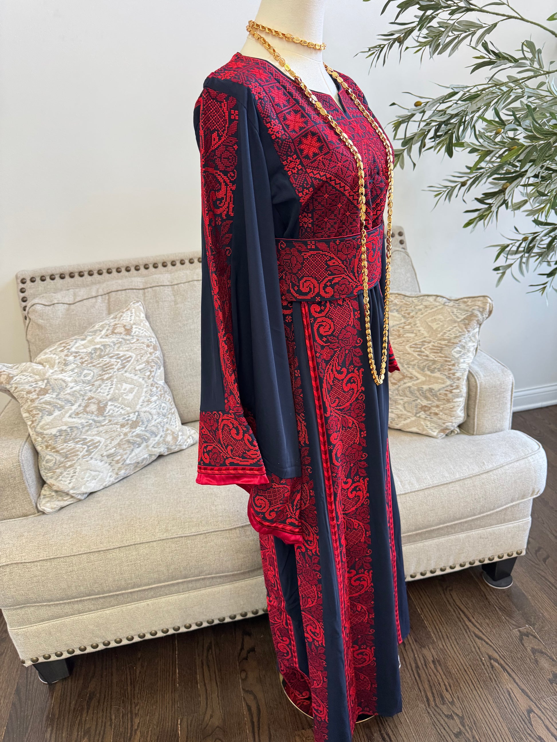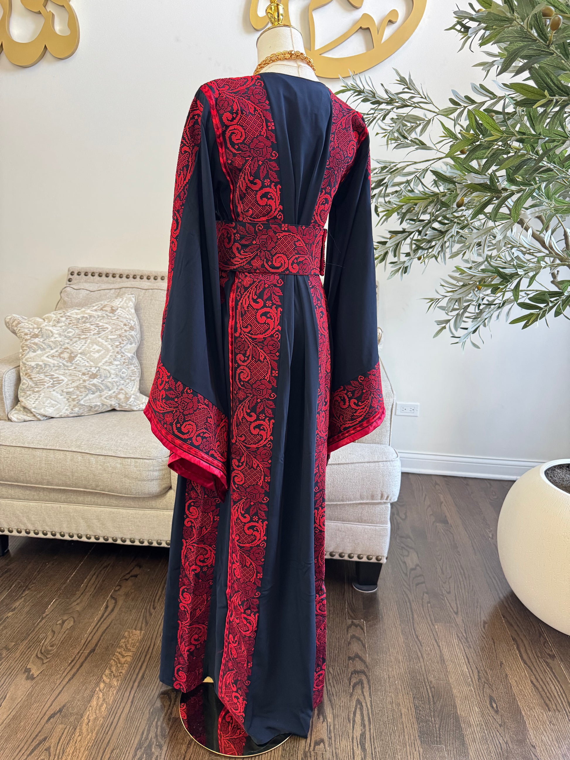 A regal Palestinian-inspired dress crafted in a rich navy base, adorned with bold red woven embroidery that flows vertically from bodice to hem. The geometric and arabesque patterns are meticulously placed to elongate the silhouette and highlight the waist, enhanced by a structured embroidered belt that adds definition and elegance.